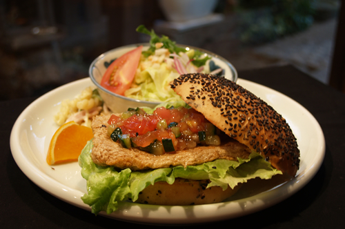 黒胡麻のバンズに、じゃこ天・トマトサルサをサンドした、サッパリとしたじゃこ天バーガー